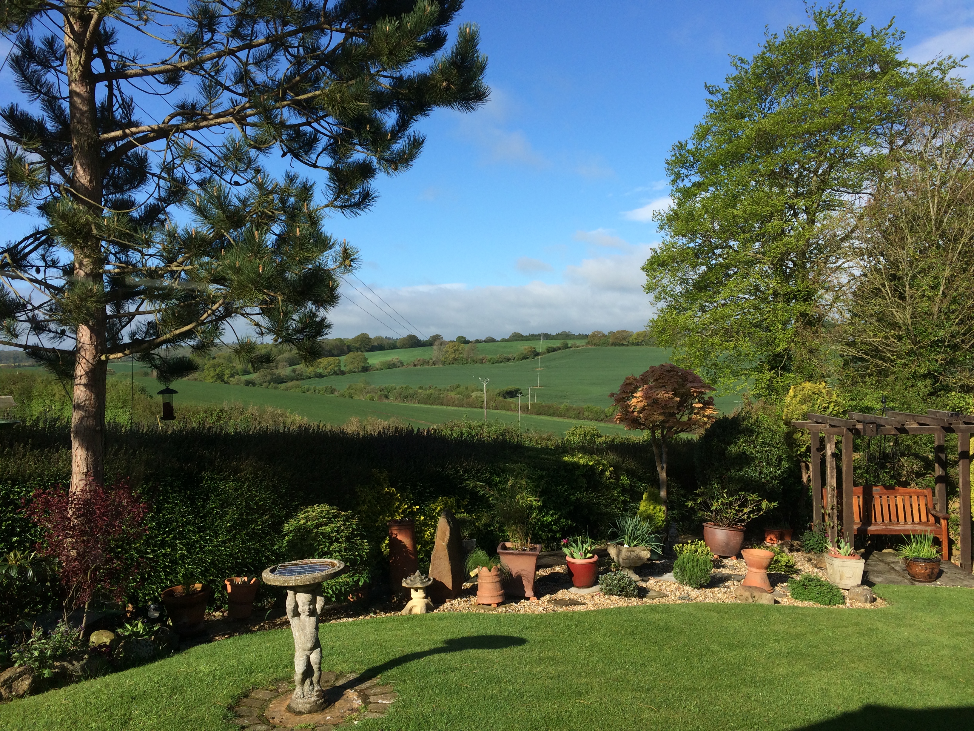 Pat cooked us a lovely English breakfast every morning which we ate in a small sunroom looking out on a beautiful garden, and, beyond that, wide open green fields. We had quite a lot of rain and wind the first day or two, but by the last day there we got some beautiful sun. (As Colin said, “we don’t have a climate in England, we just have weather.“)
